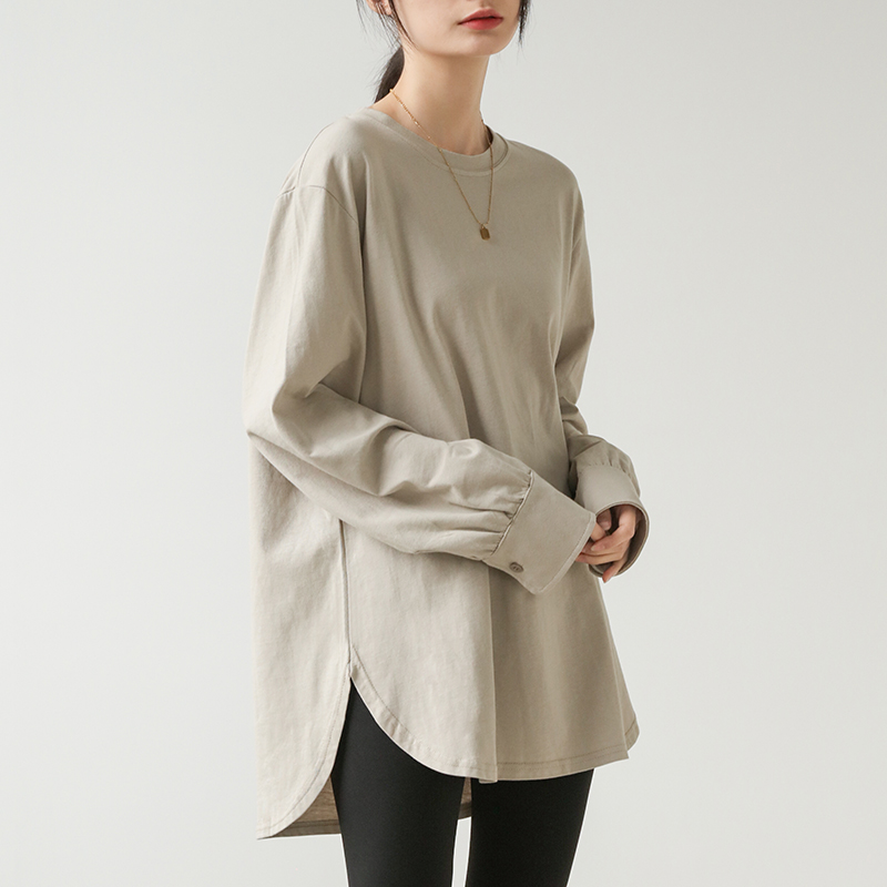 ゆったりとしたシルエットと長めの丈が特徴的なカットソー。