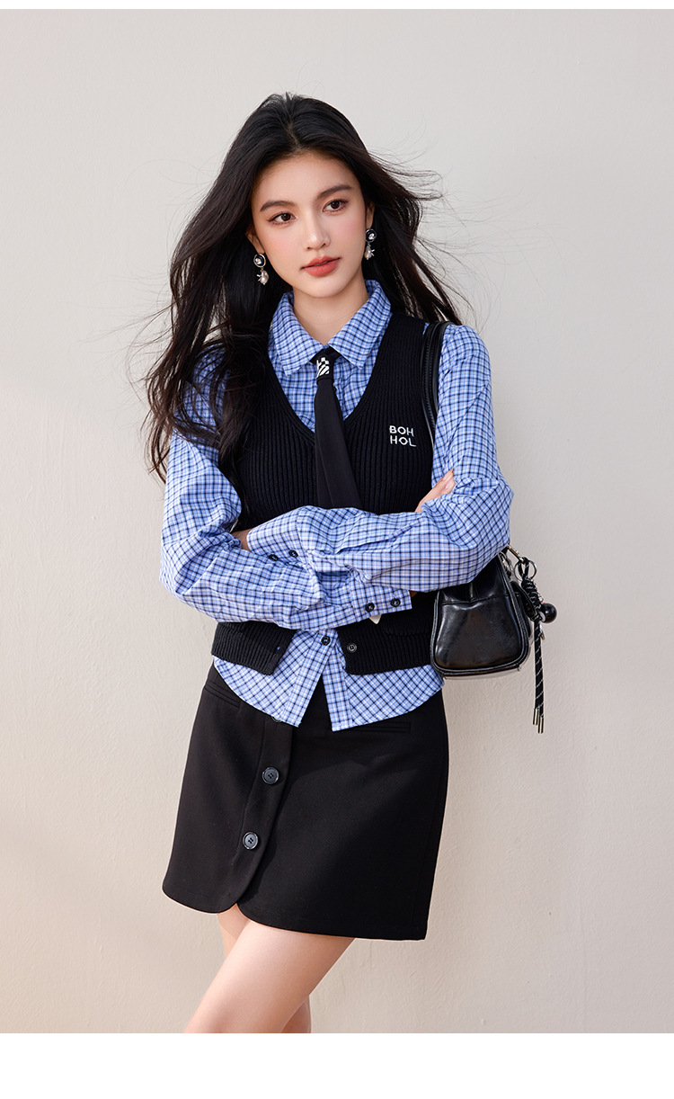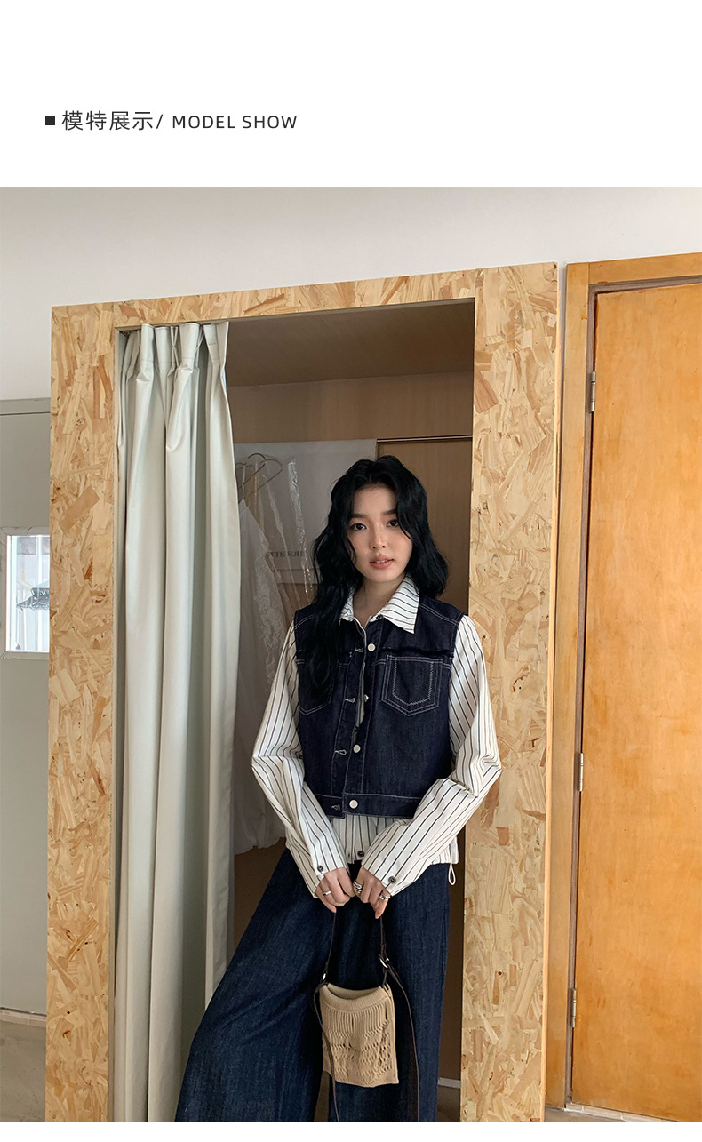 デニム素材のベスト部分とストライプのシャツ部分が絶妙なバランスで調和し、ジェンダーファッションレスならではの自由な発想を表現。