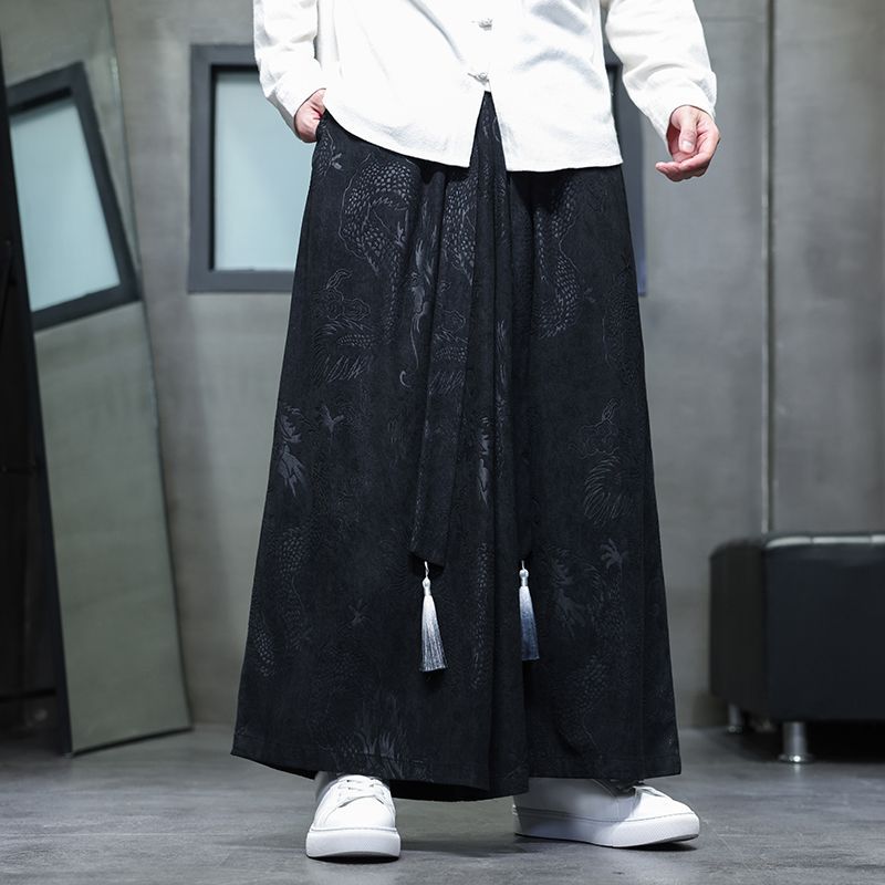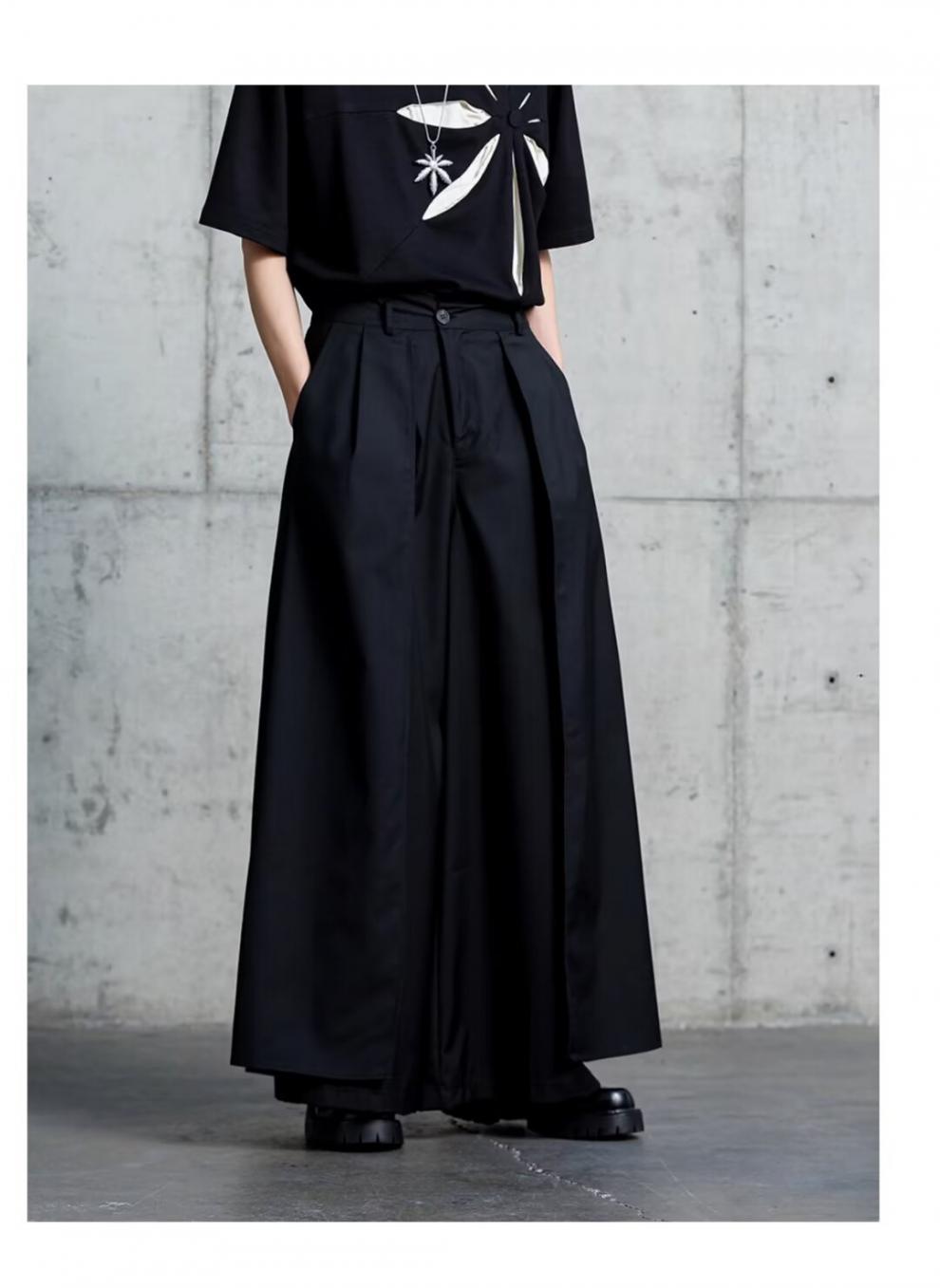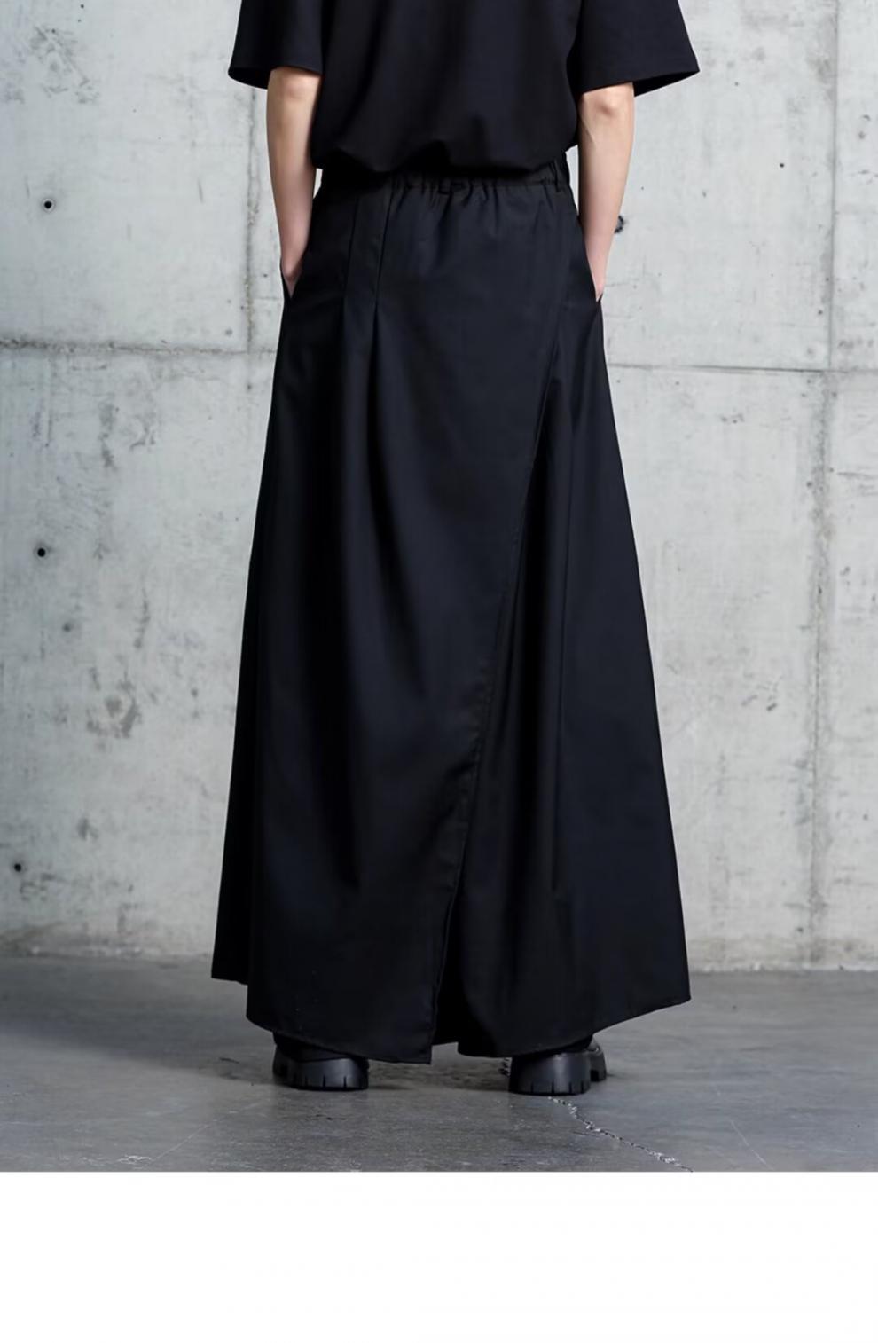ドレープ調のシルエットが下半身のラインを自然にカバーしながら、洗練された印象を与えるジェンダーレスファッションの定番アイテム。