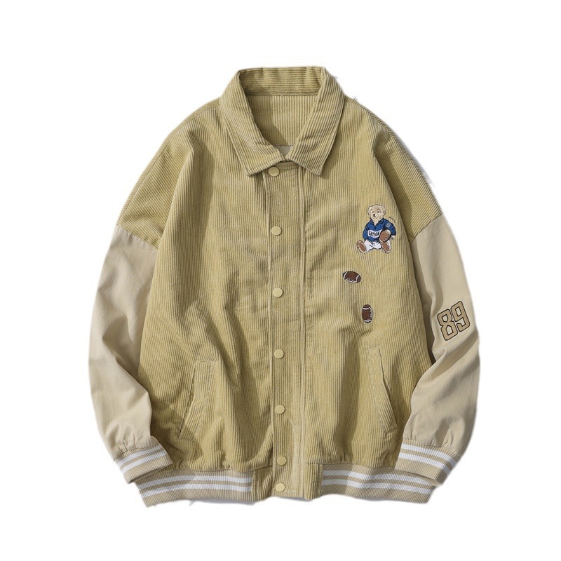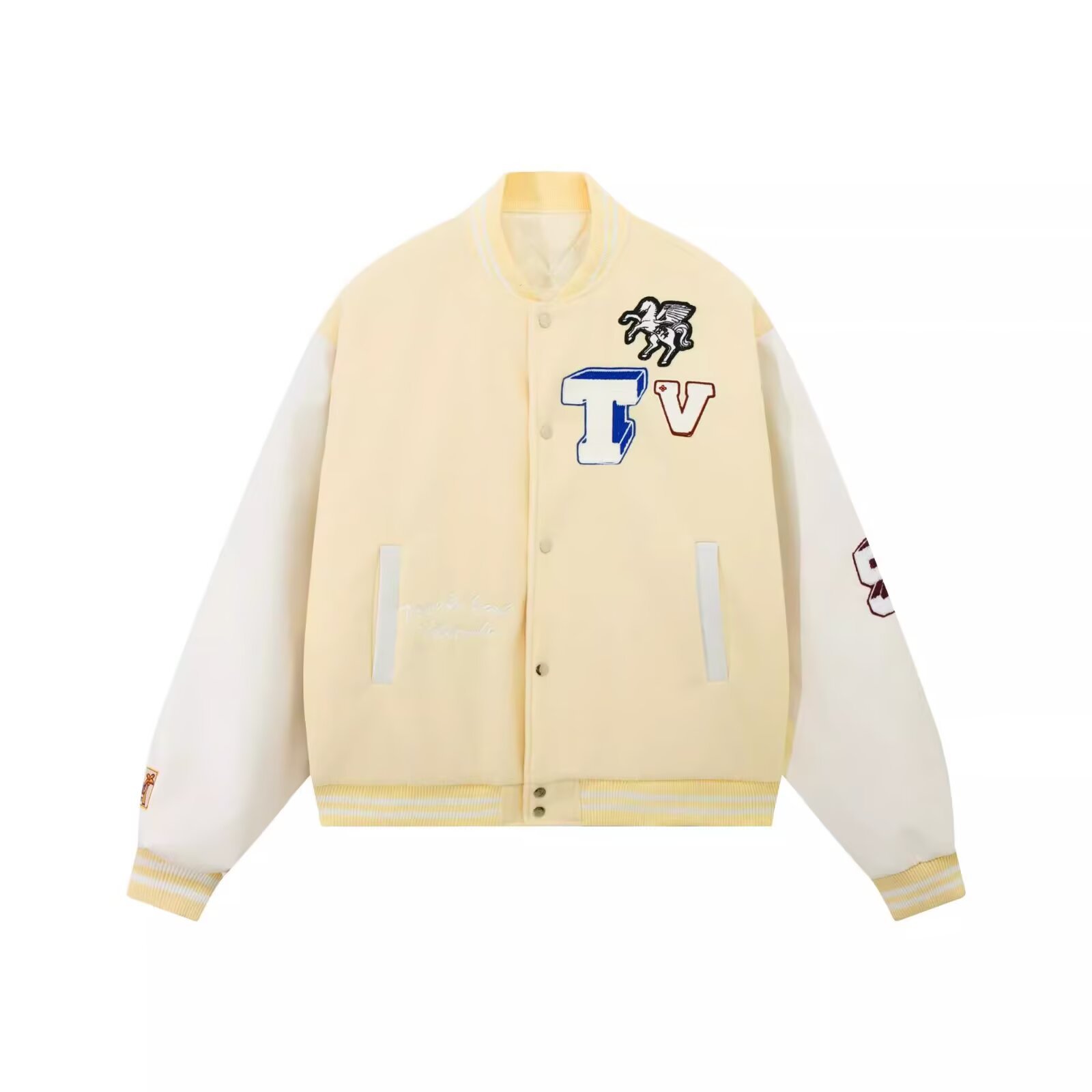 キャメルとクリーム色の組み合わせが温かみのあるこのジェンダーレスファッションのレタードジャケットは、胸元の星マークとロゴが特徴的です。