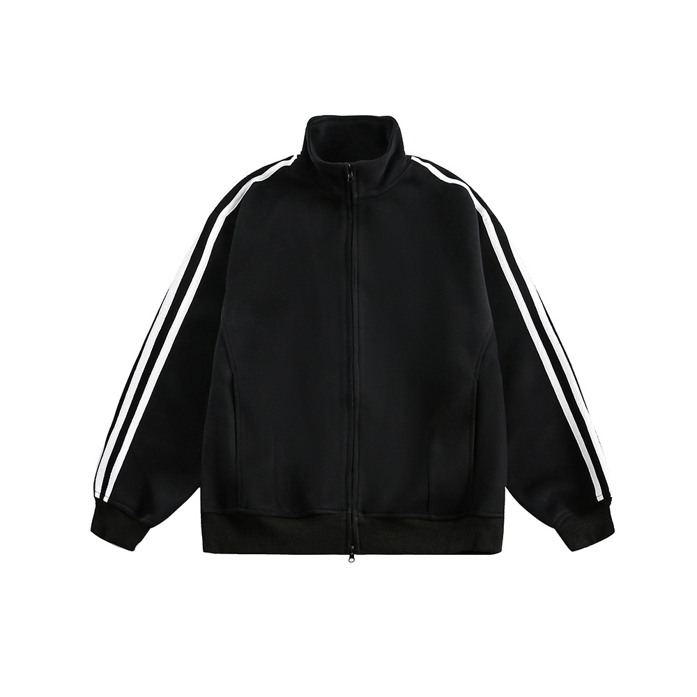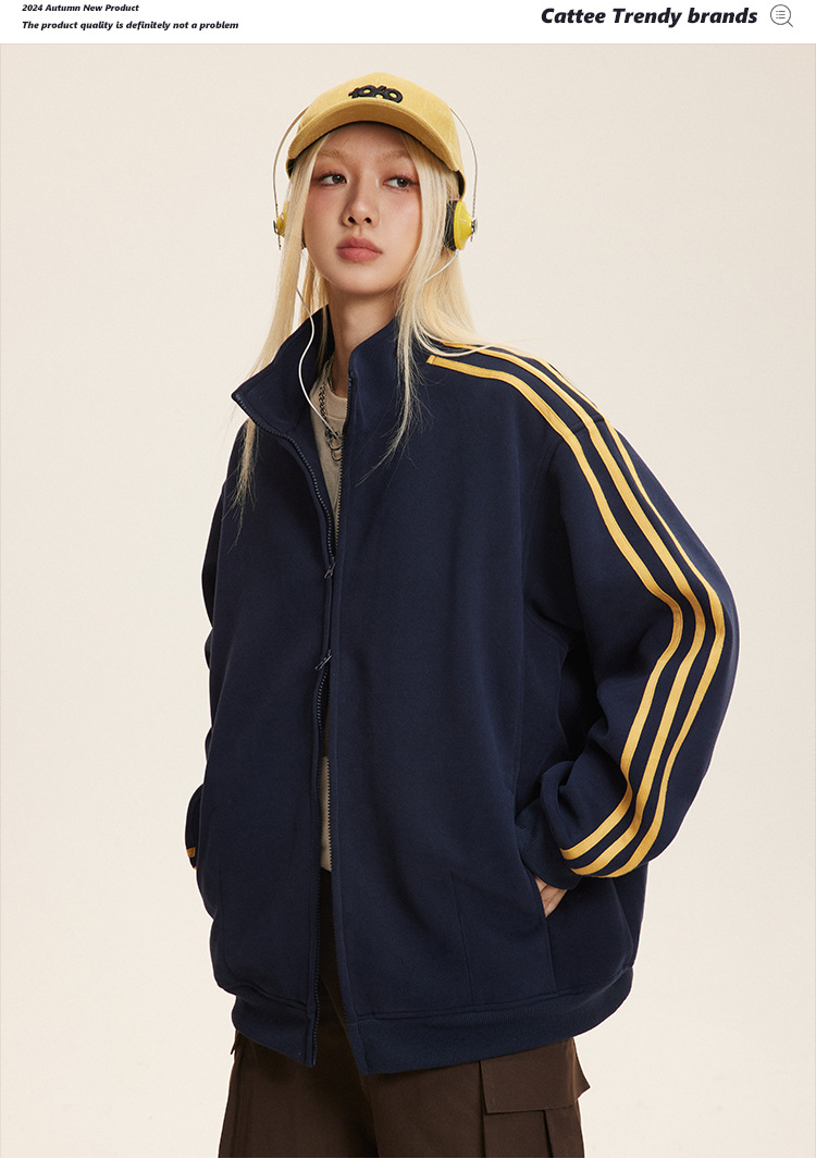 ネイビーベースにイエローのラインが映えるスポーティーなジップジャケットは、ジェンダーレスファッションの中でも特に人気の高いアイテムです。