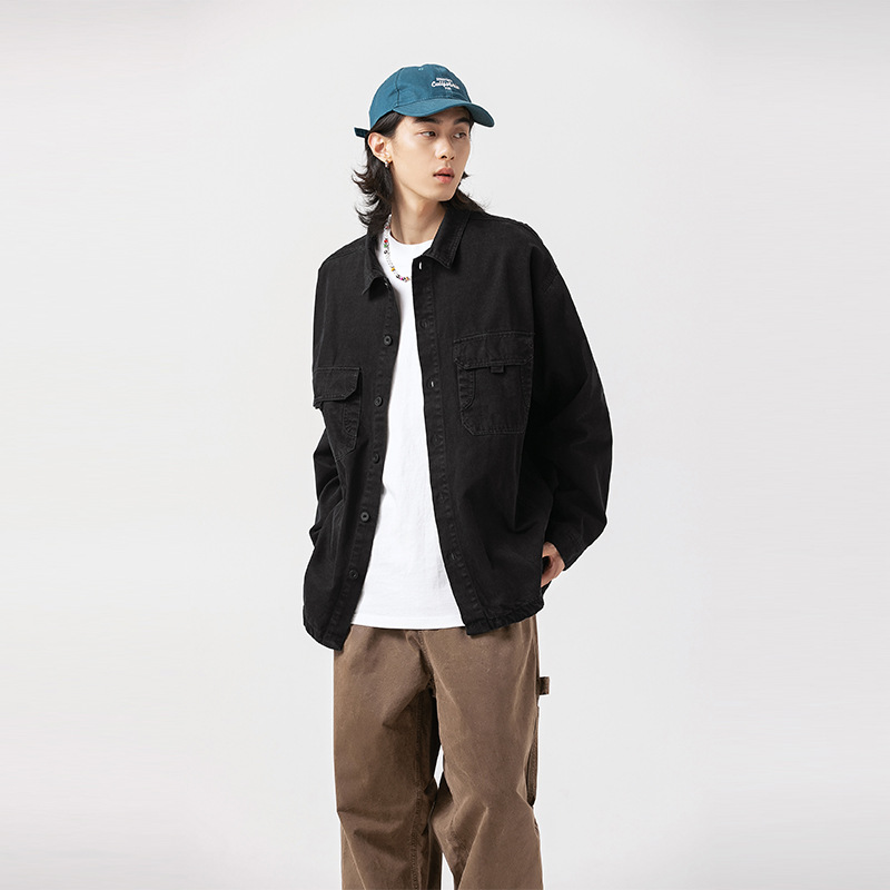 黒のシックなカラーと機能的なポケットデザインが都会的な印象を与え、様々なボトムスと相性抜群です。