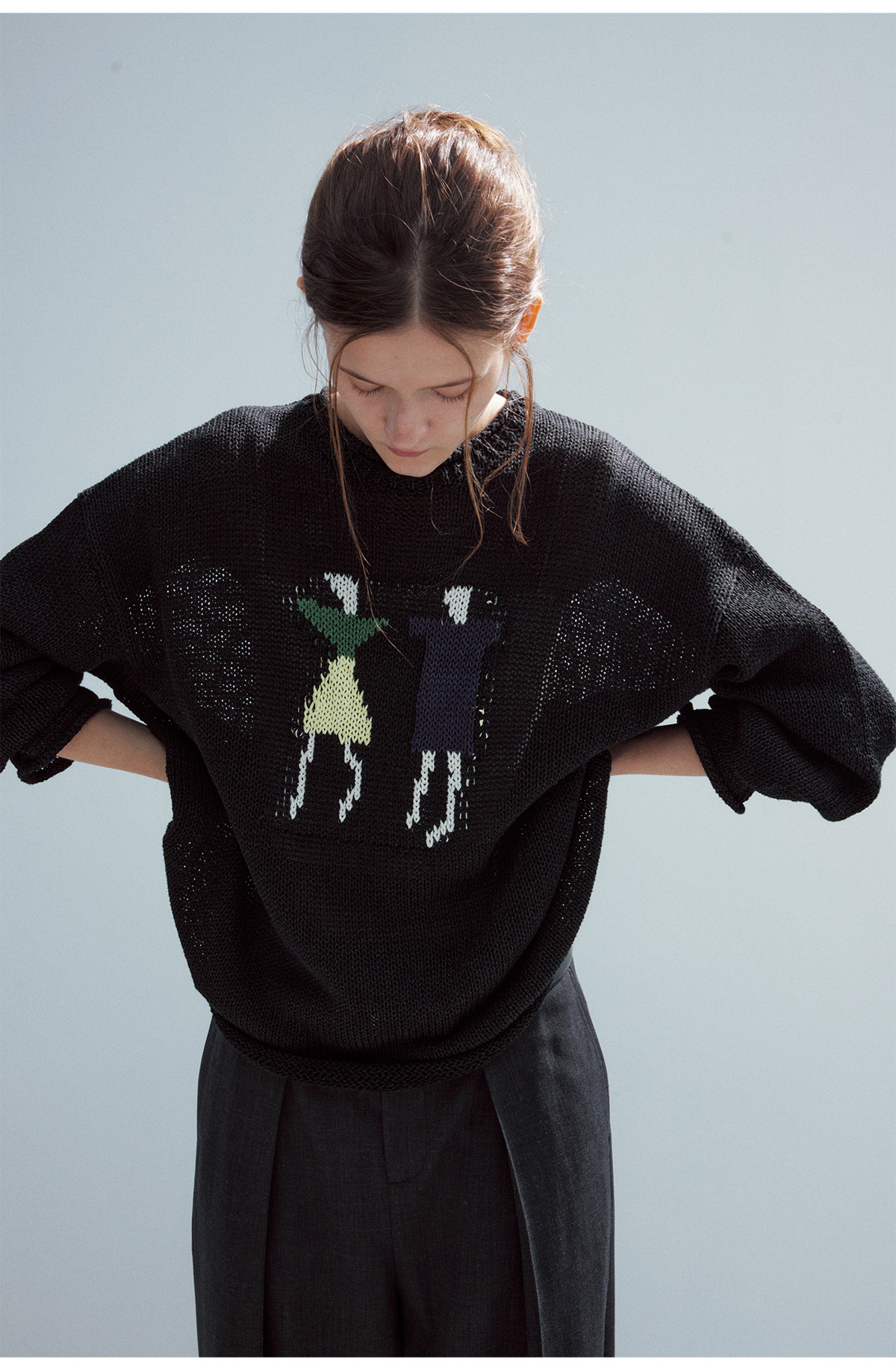 繊細な模様編みが施された黒のニットは、シンプルながらも奥行きのある表情が魅力のジェンダーレスアイテム。